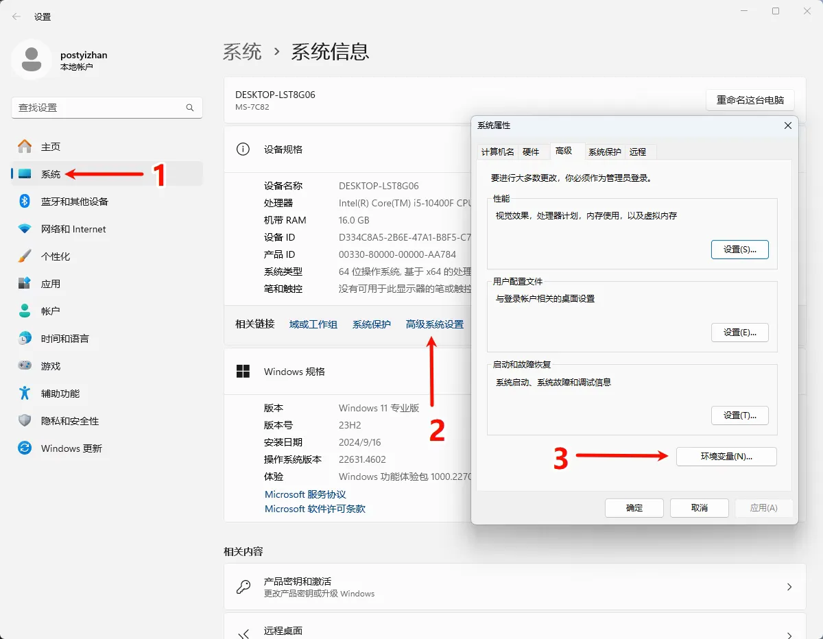 在“系统”点击“高级系统设置”,在弹出的窗口中点击“环境变量”。