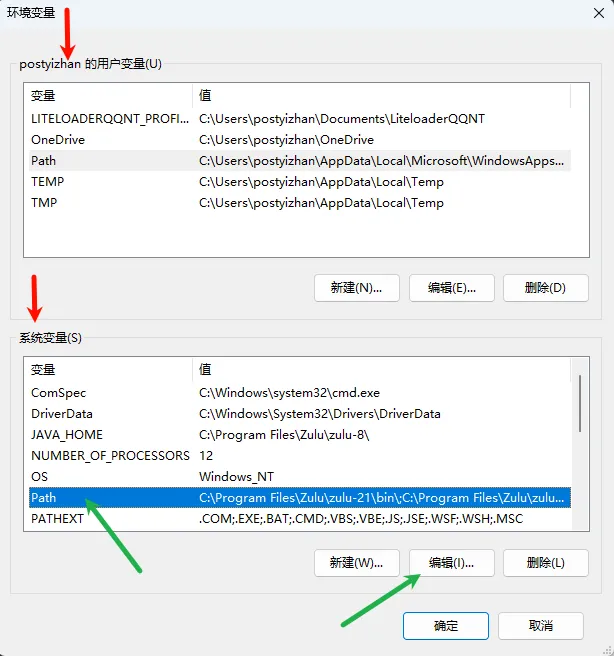 可以看到,在名为“编辑环境变量”的界面中,我安装包安装的两个 Java(Zulu 8 和 Zulu 21)都有环境变量(红框部分)。