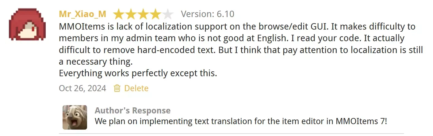 作者在 Review 中回复,MMOItems 更新到 7.0 后将支持编辑界面的本地化。